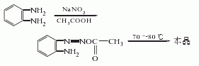 1.由鄰三胺與亞硝酸鈉反應而得。將鄰二胺加入50℃水中溶解,再加入冰醋酸,降溫至5℃,加入亞硝酸鈉攪拌反應。反應物漸漸變成暗綠色,溫度升至70-80℃,溶液變?yōu)榻奂t色,于室溫放置2h,冷卻,濾出結晶,用冰水洗滌,干燥得粗品,將粗品減壓蒸餾,收集201-204℃(2.0kpa)的餾分,再用重結晶,可得熔點為96-97℃的產品,產率80%左右。曾有報道用亞硝酸鈉處理多菌靈的縮合廢水而得副產物并三氮唑。